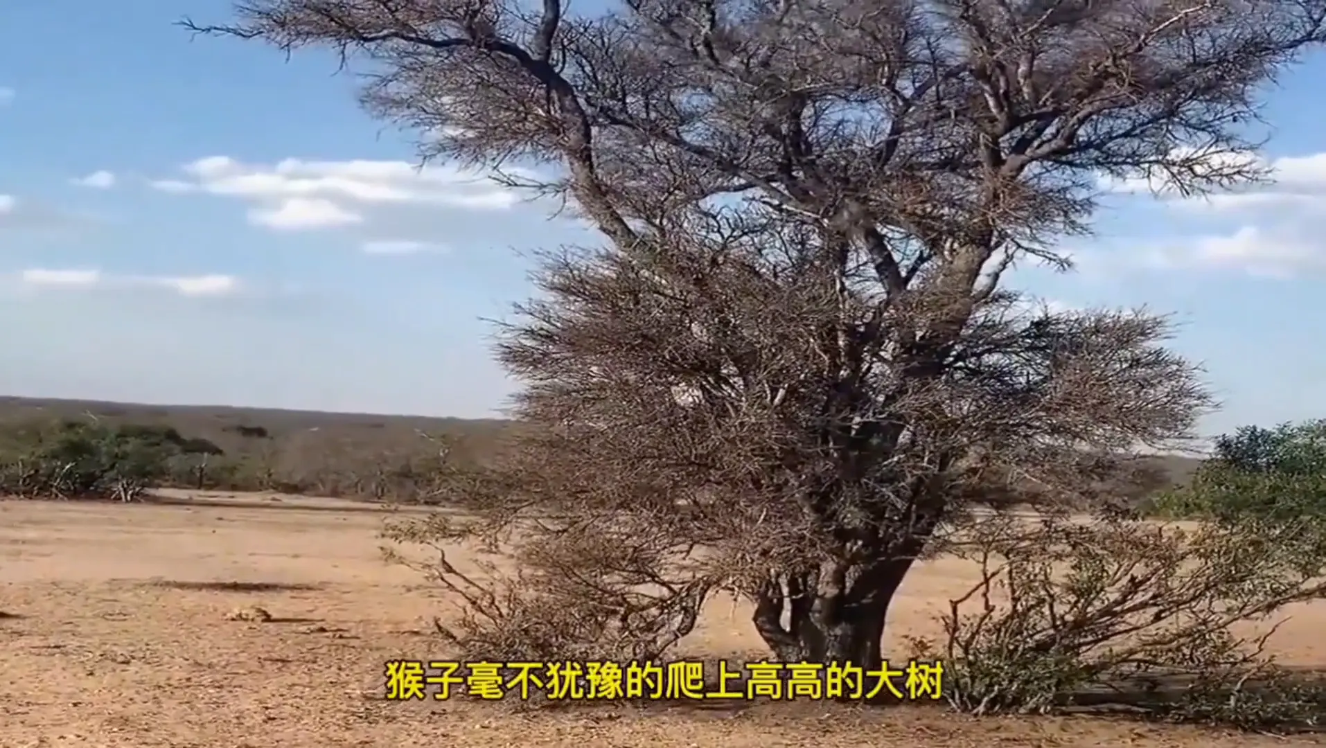 猴子利用灵活的身法,不停地在枝头来回穿梭跳跃,而花豹只能爬上去跳下来,爬上去再跳下来,局势僵持十分钟之久。此时花豹明显体力不支,眼看吃肉无望,心有不甘的花豹不得不放弃眼前这顿美餐,真是太可怜了。