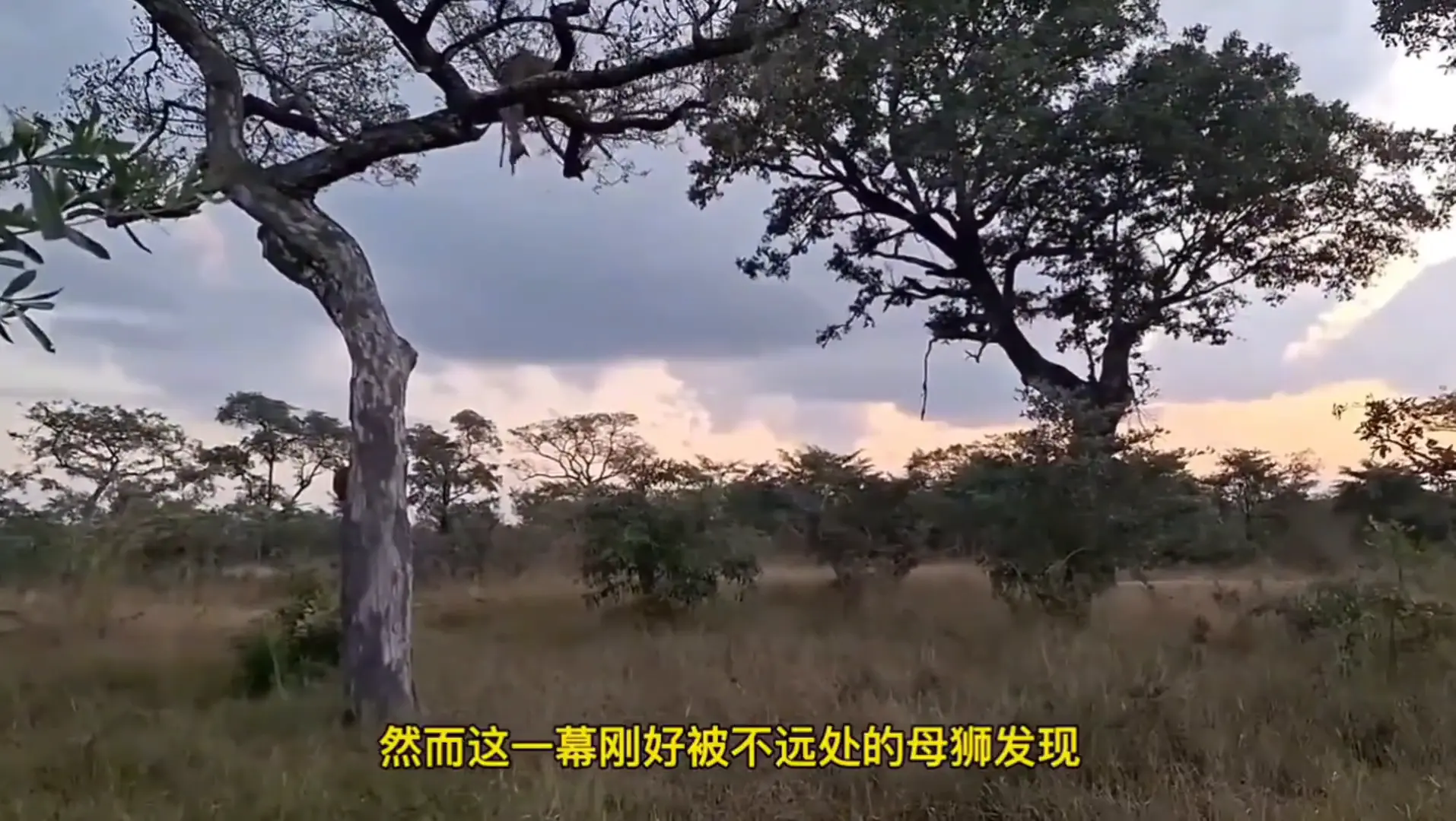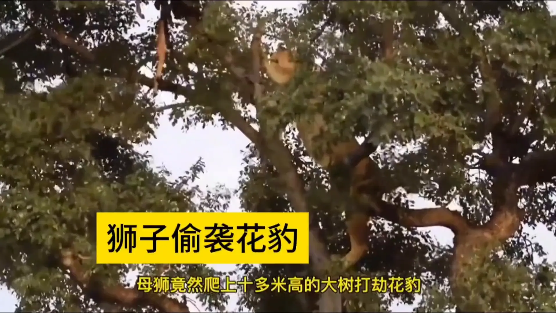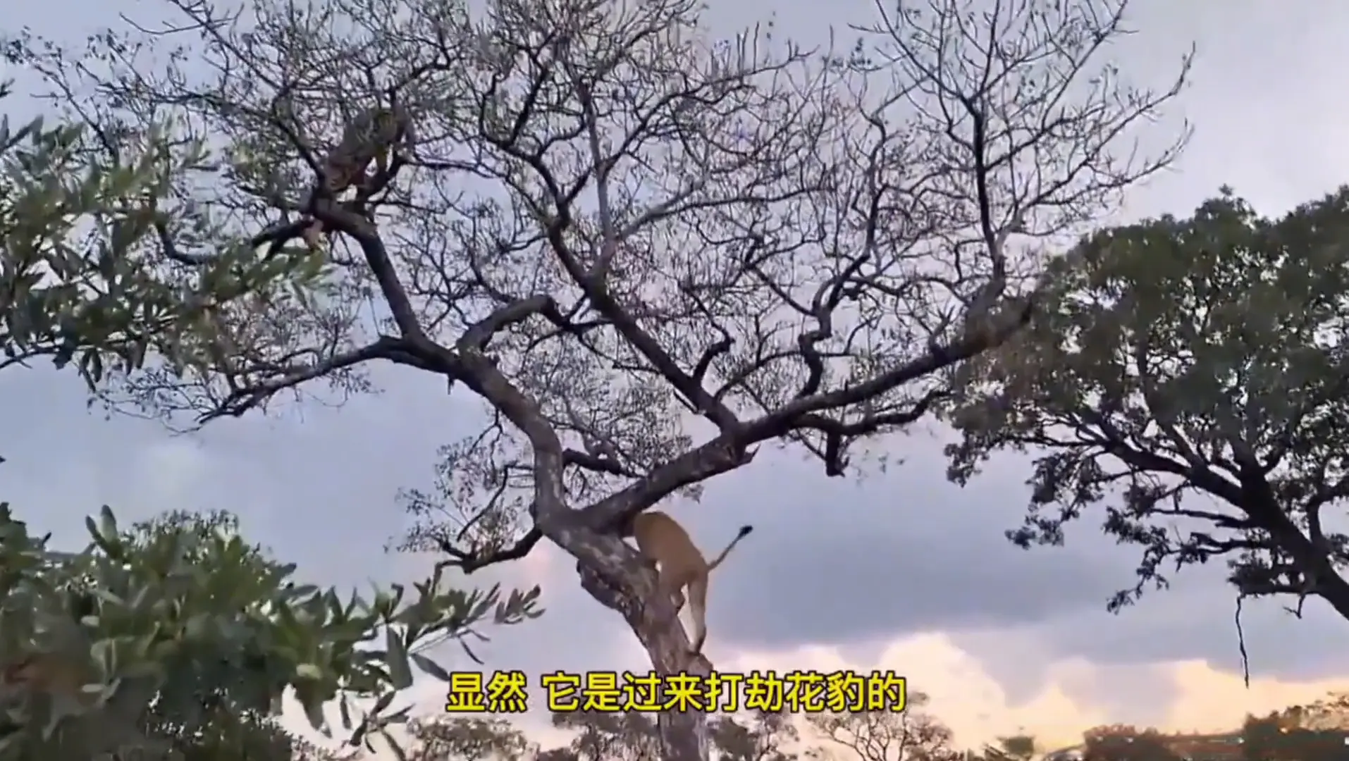 然而这一幕刚好被不远处的母狮发现,母狮见状立马飞奔而来,随即便毫不犹豫的爬上大树,显然它是过来打劫花豹的。母狮率先发难与花豹争夺美食,为求自保花豹不得不放下猎物进行反击。
