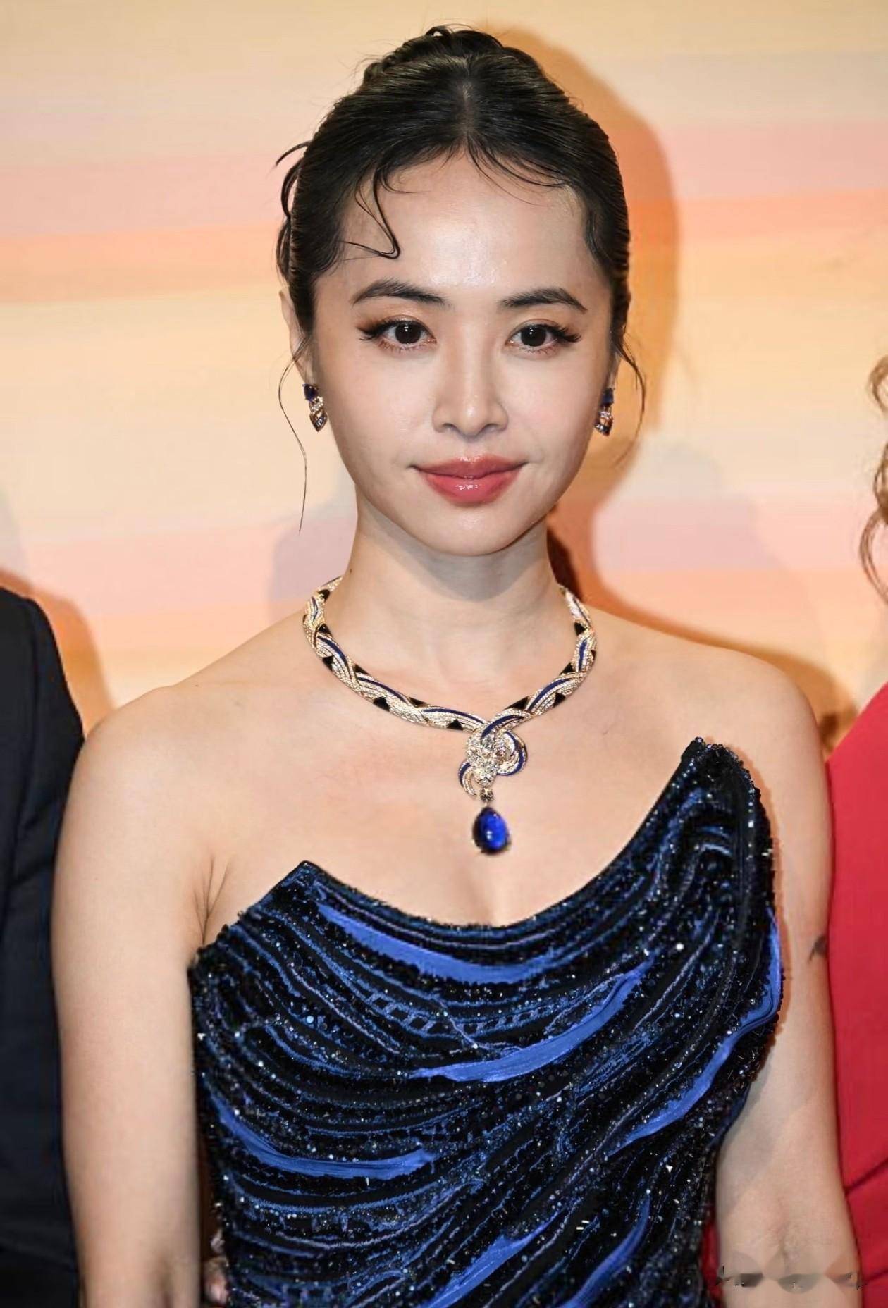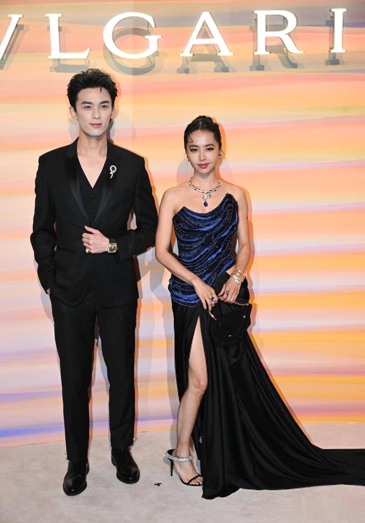 脚上穿的是黑色细高跟凉鞋,鞋头是尖头的,看着很利落,脚踝处还套了一个满钻的银色脚环,钻特别闪,刚好和礼服上的亮片呼应,也让露出来的腿更有看点。手里拿的是一个黑色迷你手包,包身是绒面的,上面有细闪,手柄是金色的,还嵌了一颗白色的宝石,看着很精致,刚好能握在手里,不会抢礼服的风头。