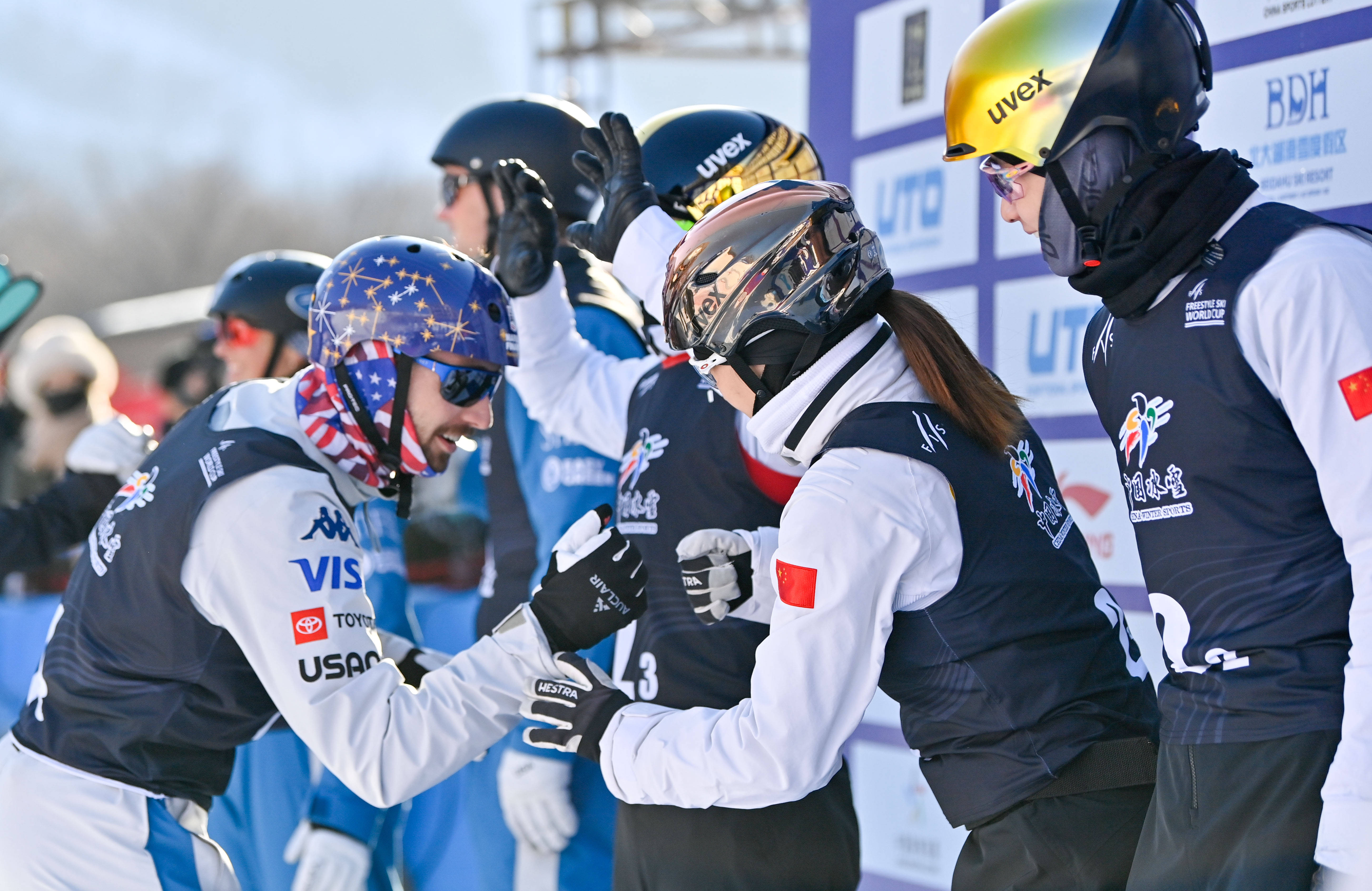 2025年2月24日,美国选手克里斯托弗·利利斯(左一) 与徐梦桃(右二)在比赛后相互致意。